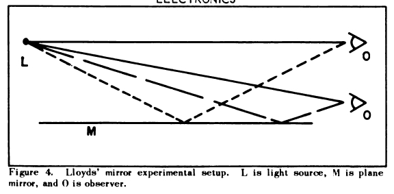| Figure 4. Lloyds' mirror experimental setup, L is light source, M is plane mirror, and O is observer. |