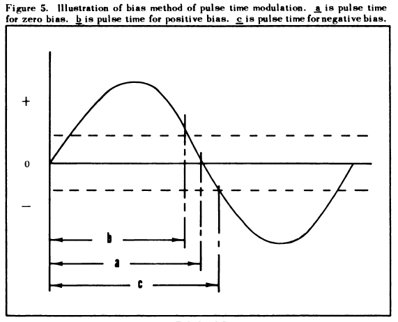 | Figure 5. Illustration of bias method of pulse time modulation. a. is pulse time for zero bias. b. is pulse time for positive bias. c. is pulse time for negative bias. |