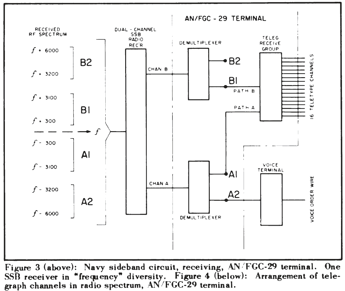 In addition to "space" diversity radio reception, which has been used for many years in long-distance radio communications to reduce the effect of fading, the AN/FGC-29 terminal, by providing split sidebands, allows the use of "frequency" diversity with only one receiving antenna and one single-sideband radio receiver. In this system the same multi-channel telegraph signal is transmitted simultaneously over two of the partial sidebands (assumed in figure 3 to be A1 and B1, although another two of the partial sidebands A1, A2, B1, or B2 could be used).