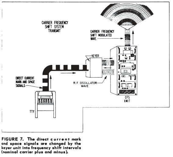 At the transmitting end of the long-range system are a teleprinter, a transmitter, and a frequency shift keyer unit which is built into the newer transmitters. In some older systems the keyer unit is a separate piece of equipment. When the teleprinter is operated, the direct-current teleprinter mark and space signals are changed by the keyer unit into frequency shift intervals. The frequency shift intervals are transmitted as carrier frequency shift signals (figure 7).