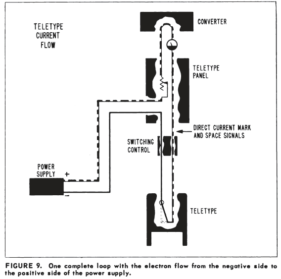 When the Teletype system is in operation, the electron current - which flows from negative to positive - flows from the negative side of the power supply through the Teletype panel, through the teleprinter, back through the Teletype panel, into a converter or keyer unit, through the Teletype panel a third time, and from there on to the positive side of the power supply.