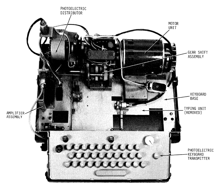 The signal generating mechanism utilizes photoelectric cells instead of a contact mechanism to generate a signal. A lamp assembly provides the necessary light source to electrically activate the cells. A mechanical shutter assembly, linked with the keyboard codebars and located between the photocells and lamp assembly, provides windows to either allow light from the light assembly to pass and activate the cells (mark) or block the light and not activate the cells (space). The photocells will generate a parallel electrical signal of approximately 300 microamperes (ua). The generated signal travels along a shielded cable to a photoelectric distributor. The photoelectric distributor serializes the signal, and by means of shielded cables, routes it to the input of a polar line keyer.
