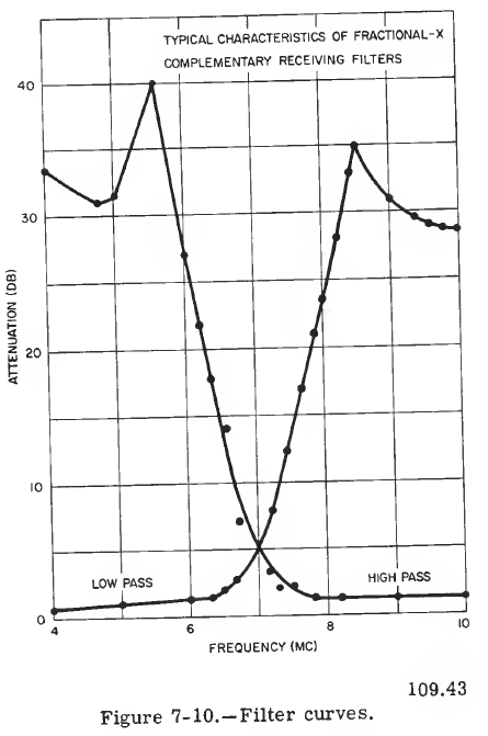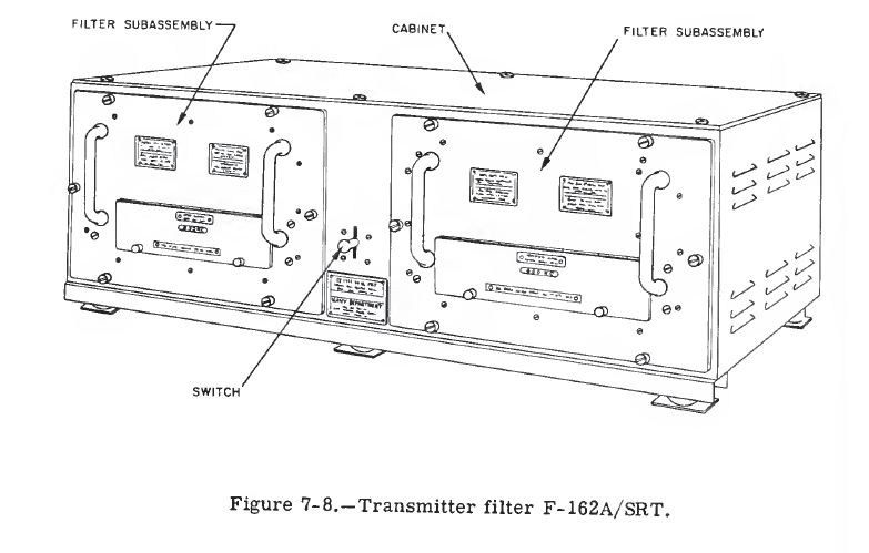 Transmitting Filter Assemblies - The filters that will now be described have been designed for use with shipboard transmitters and antennas that are unbalanced to ground. This series includes Electrical Filter Assemblies F-159/SRT, F-160/SRT, F-161/SRT, F-162/SRT, and F-163/SRT. A representative filter assembly of this series, the F-162A/SRT, is shown in figure7-8. Each filter assembly consists of low-pass and high-pass subassemblies. They are used with transmitters operating in the frequency range between 175 kc and 27 mc. Single filter assemblies (fig. 7-9) can be used alone or combined with other subassemblies to operate two or more transmitters (using different frequencies) into a single antenna. Because a low-pass filter and a high-pass filter are used in each filter assembly, there is a definite crossover frequency for each filter. In the vicinity of the crossover frequency there is a band of frequencies, called the precluded band, which cannot be used because appreciable power would be lost in the filter. When frequencies in the vicinity of the crossover frequency are to be used, it is necessary to change the crossover point. By removing the crossover point around as the precluded band is approached, it is possible to obtain continuous coverage of the 175-kc to 27-mc frequency range, A switch in the center of the front panel on all assemblies except the F-160/SRT, permits shifting of the crossover frequency. Figure 7-10 shows curves for both low-pass and high-pass filters for the F-162A/SRT. The filter assemblies are constructed in the form of plug-in drawers. Normally, the lowpass drawer is installed on the left side of the cabinet and the high-pass drawer on the right side, as viewed from the front, however it is possible to interchange the subassemblies from left to right in the cabinet by changing a connecting strap in each subassembly. In normal operation, the filter assemblies dissipate less then 20 percent of the r-f power output of the transmitter. Because it is possible for a fault, such as a grounded antenna, to develop, each filter subassembly is designed to dissipate over 500 watts, if necessary. Because the low-pass filter section provides a termination for the high-pass section and vice versa, it is not advisable to operate a transmitter into one section alone. If it becomes necessary to operate a transmitter when either filter section is removed, a jumper assembly furnished with each cabinet is used to connect the transmitter directly to the antenna. Other transmitting filter assemblies presently in use include the F-156, -157, and -l58/URT. |