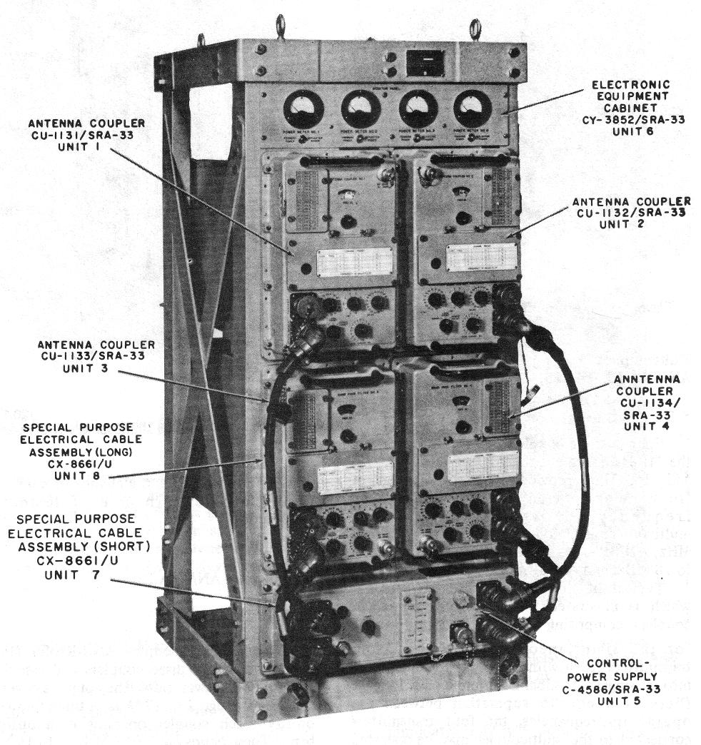 The AN/SRA-33 consists of four antenna couplers (CU-1131/SRA-33 through CU-1134/SRA-33), a control power supply C-4586/SRA-33, an electronic equipment cabinet CY-3852/SRA-33, and a set of special-purpose cables. |