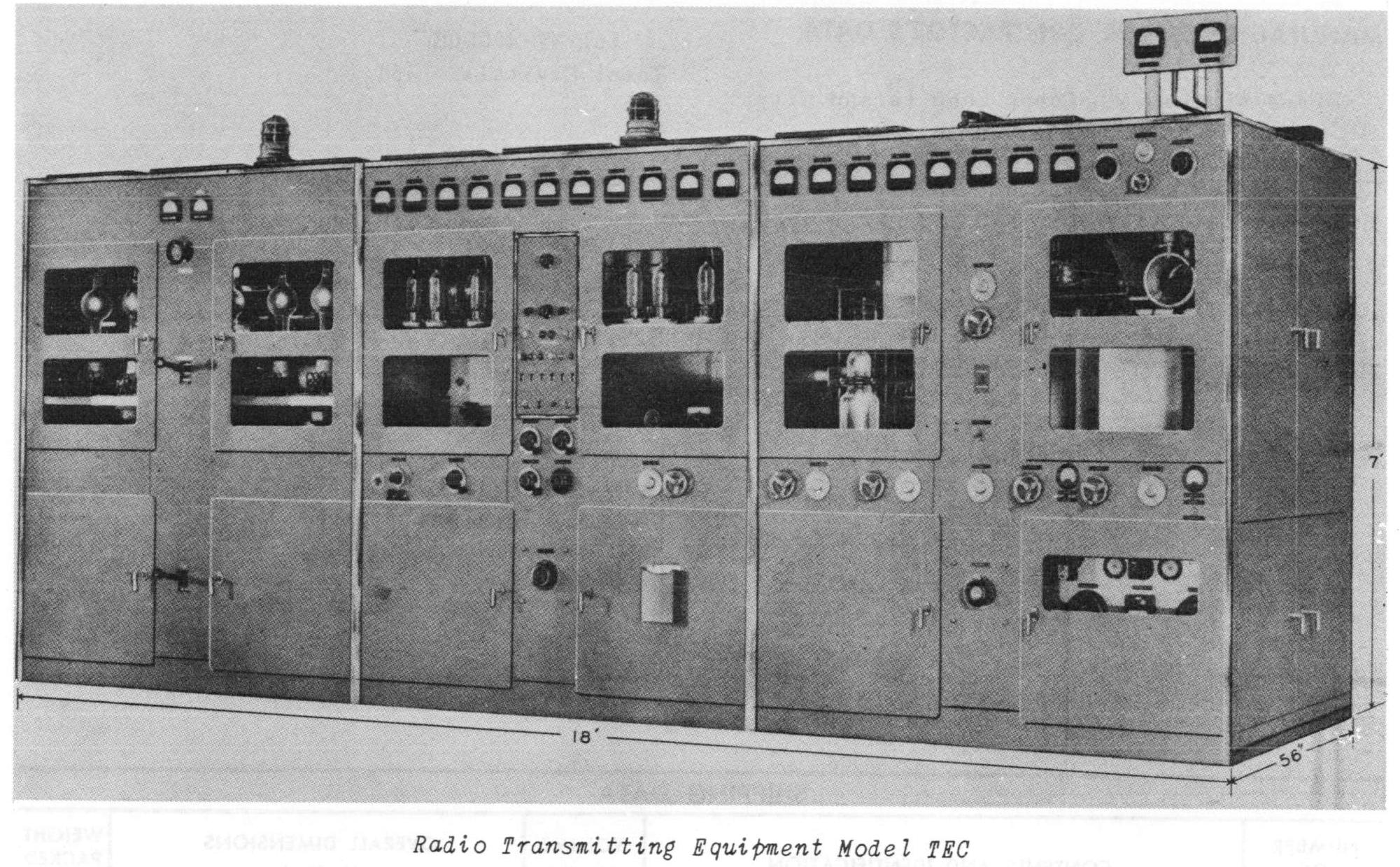 Radio Transmitting Equipment TEB is used for general purpose, high-power, h-f, radiotelegraph, or frequency-shift operation in shore-to-ship, and point-to-point communication. Vacuum-tube keying speeds up to 400 wpm are possible, and provision is made for the connection of an external frequency shift keyer. Six preset crystal-controlled channels ore available, and provision is made for connection of an external master oscillator. An automatic control circuit will shut down the entire equipment, except blowers and oscillator oven, if the transmitter is not keyed for a predetermined period (adjustable from two to 30 minutes). This equipment is designed to work into a balanced two-wire transmission line of 550 to 650 ohm impedance and zero reactance. |