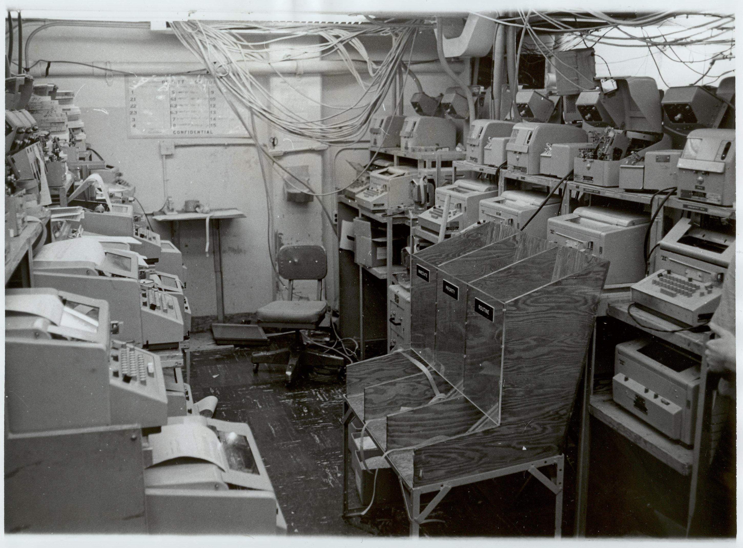 Various errors will occur, e.g., invalid routing indicator, improper message format, or improper machine functions. Messages with errors are carried to the intercept position prior to any tape multiplication or cross-office handling. Although relatively few messages contain errors, the delays resulting from the intercept operation are significant. Corrected messages from the intercept position are re-filed on a special ILU. From that point, the message is transferred cross office or the necessary additional tapes are prepared. Figures G-1 and G-2 show typical manual tape relay station operation rooms.