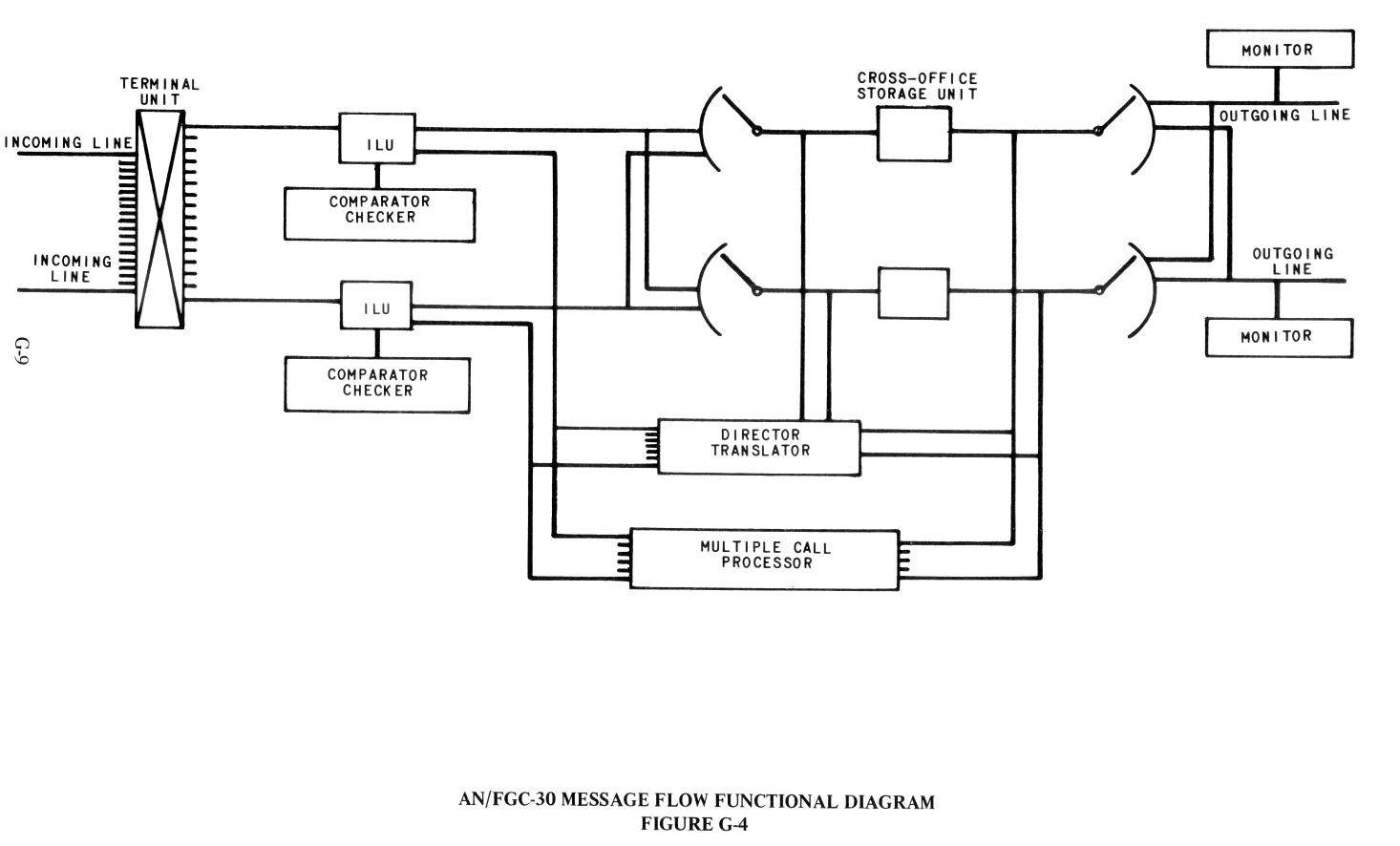 The AN/FGC-30A is designed to operate as a fully automatic message-switching center (Figure G-4); under emergency conditions, it can continue to function as a manual (torn-tape) center. Single and multiple address messages in the 5-unit International Number 2 Teleprinter code in ACP 127 format (Communication Instructions Tape Relay Procedures) are received by the center at speeds of either 60 or 100 wpm. All incoming channels are connected to an incoming line unit (ILU) where circuit access jacks allow monitoring and patching when required. The number of incoming line units, each serving two lines, is readily changed by the addition or removal of standard modules. A group of 13 ILU's (25 incoming lines plus 1 spare position, all operating at the same speed) is served by one director. The cross-office area consists of a common control with associated directors, translators, cross-office storage units, and reperforator-transmitters. When both channel speeds are used, two pools of cross-office storage units, each served by a director, are provided. These serve as temporary storage areas where tapes are grouped by precedence and outgoing line. Any cross-office storage unit can be accessed by any ILU, since there is no outgoing line unit (OLU) as such. The reader-transmitter of the cross-office storage unit transmits directly to the line and to a monitor reperforator for that line.