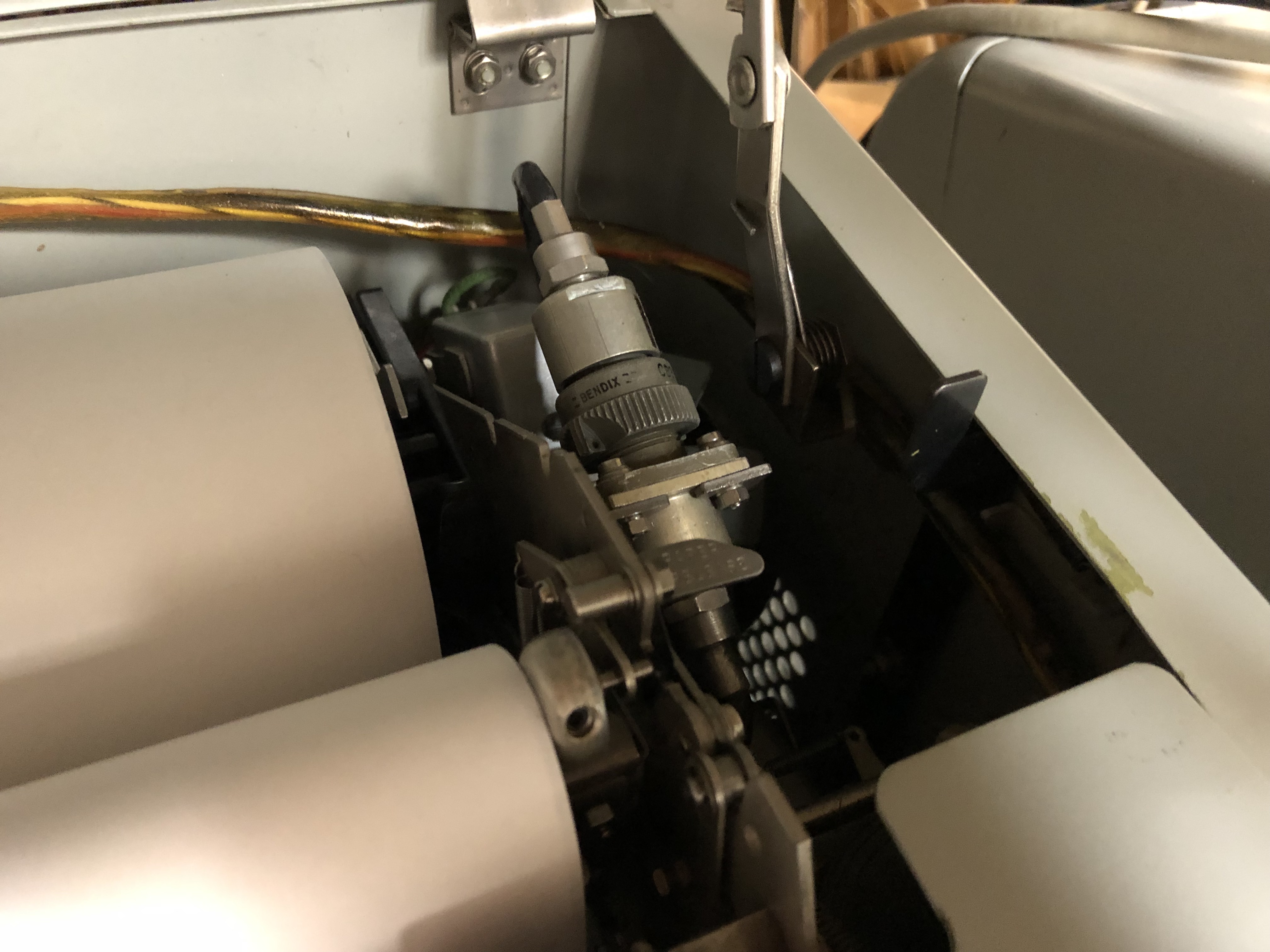 The RFI selector mechanism mounts on the upper right side frame of the typing unit. The selector consists of a special three-pin electrical receptacle, double shielded cable and metallic container.