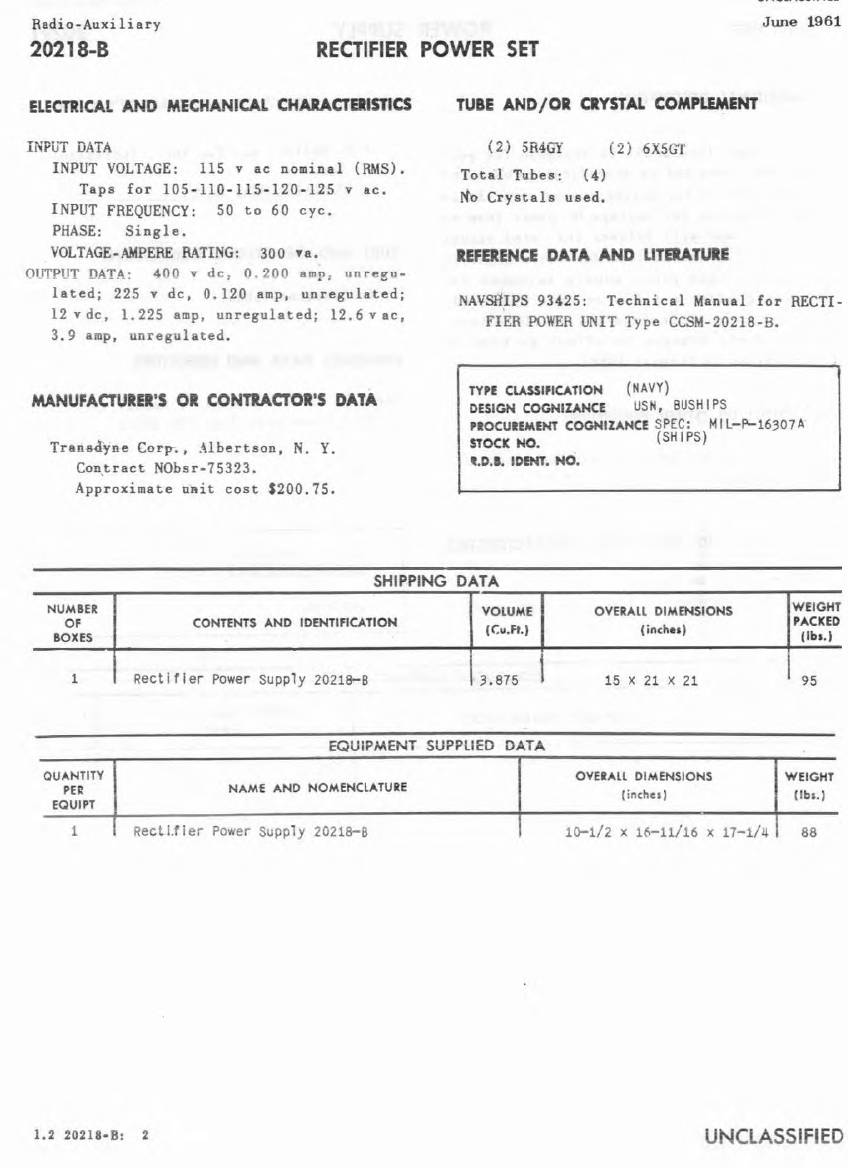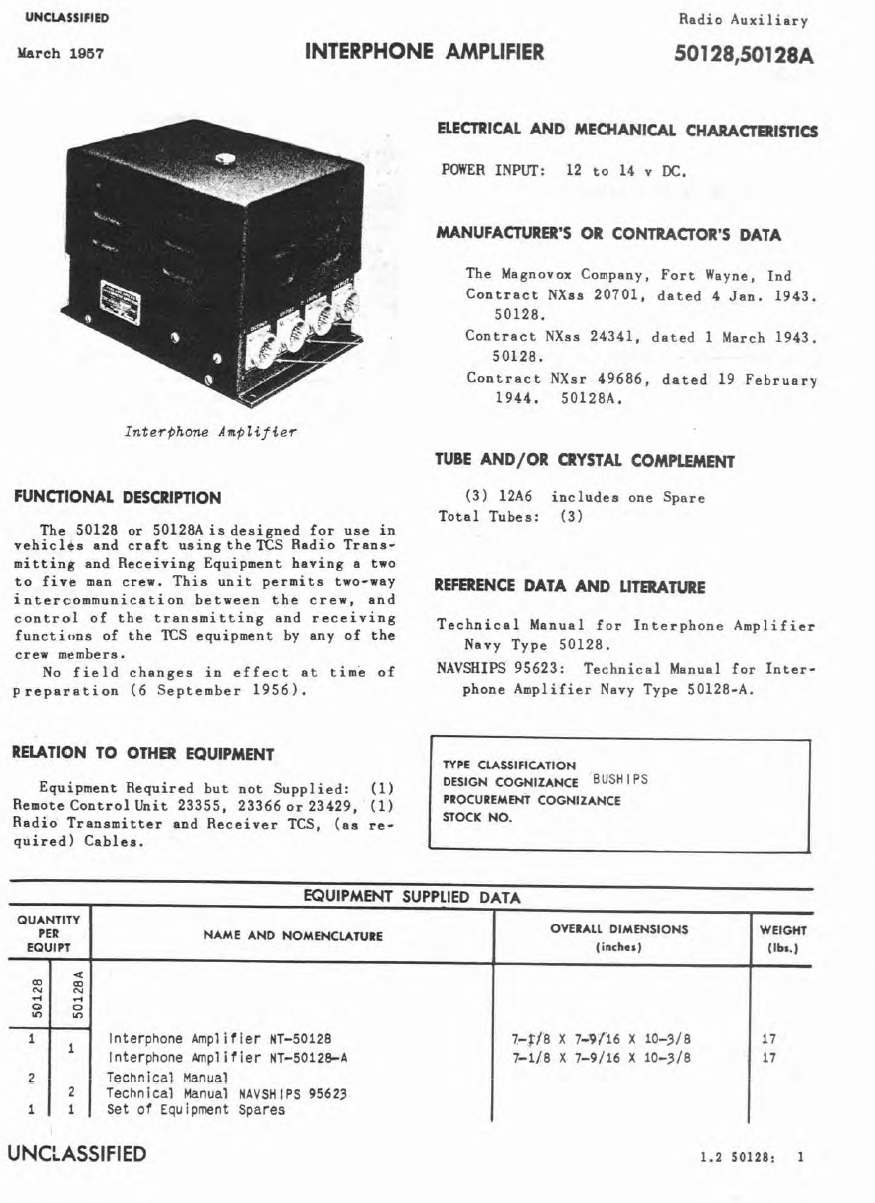 TCS Interphone Amplifier - CMX-50128, CMX-50128A"The CMX-50128 interphone amplifier is designed for use in vehicles and craft using the Navy model TCS radio transmitting and receiving equipment having a two to five man crew. This unit permits two-way intercommunication between the crew, and control of equipment by any of the crew members" |