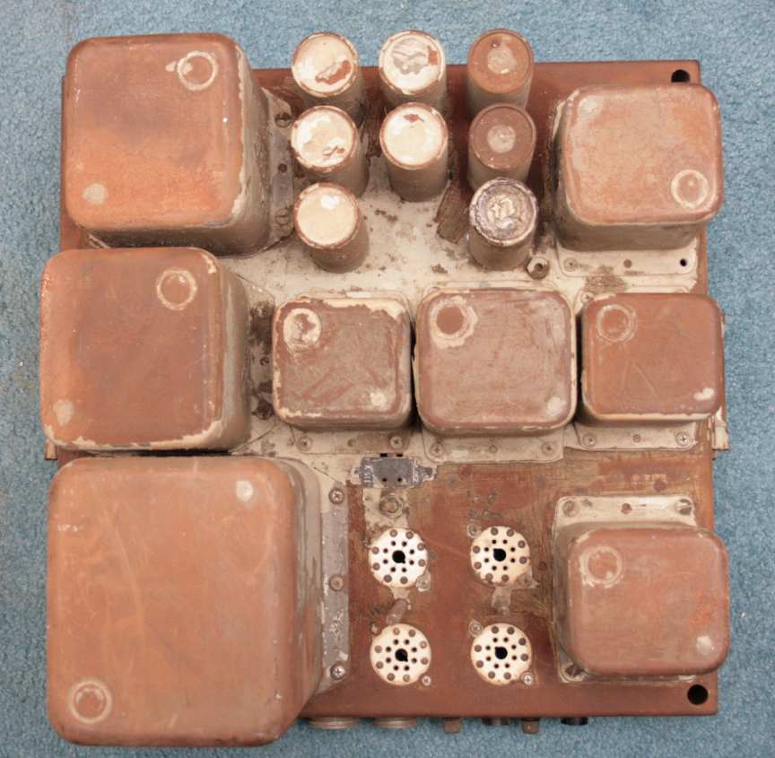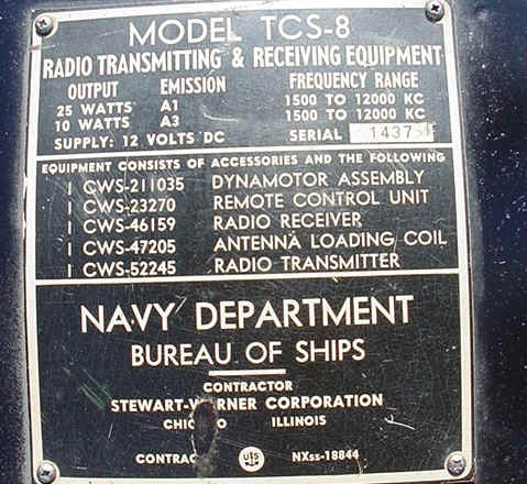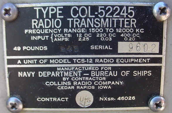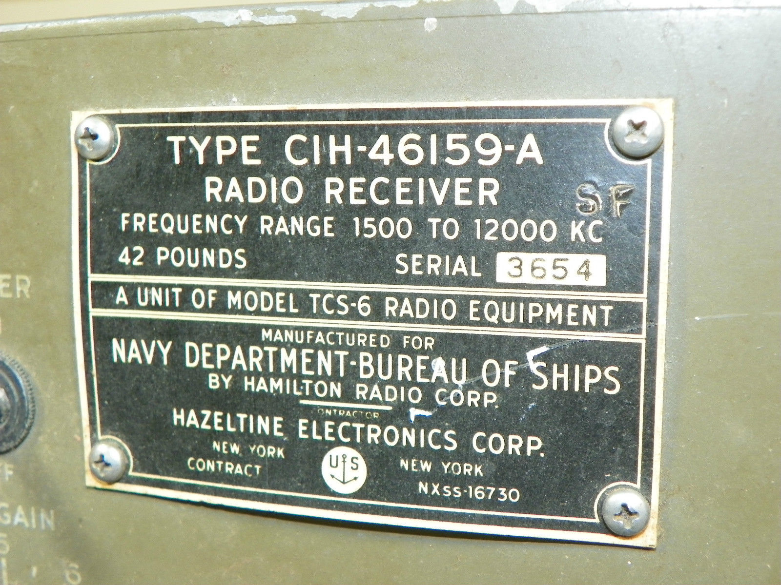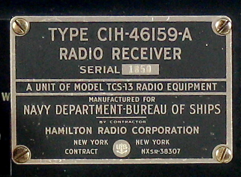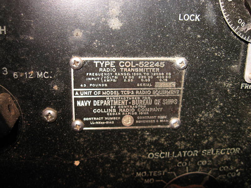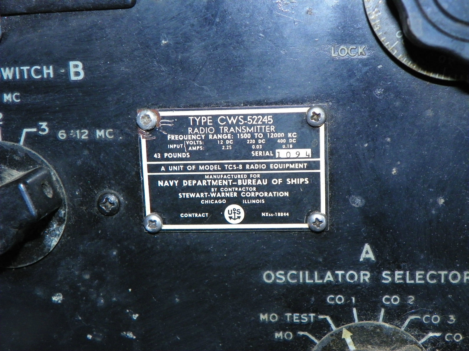 Identification Info from Robert Downs WA5CAB - "Of course, it can be difficult to impossible to ID a TCS receiver (or transmitter) as to exactly which numerical model it was originally. However, there are various clues that will narrow down the possibilities. For example, if it has round-tipped posts at each front panel corner, and/or if removing the front panel from the chassis requires either cutting or desoldering the power connector, it is TCS through TCS-5. And given that TCS-1, -2 & -3 all or most went to Russia, and, the original TCS had no nameplate and TCS-4 would be rarer, it’s probably TCS-5. If it has handles on the front panel (or the holes for them) and removing two screws frees the connector from the front panel, it is TCS-6 through 15. That plus has trimmer capacitors in the IF and BFO transformers, it is TCS-6 or -7. If it has all Phillips head screws on the front panel, it is either Stewart Warner or Collins. If the audio output or modulation transformer doesn’t say Collins, it isn’t Collins. So handles, Phillips head screws and air core IF’s makes it a TCS-7. Etc. & so forth." |
